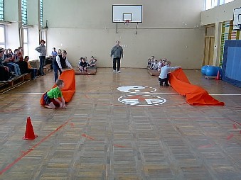 Przebieg 1. Powitanie uczniów. 2. Wyłonienie drużyn drogą losowania. 3. Nadanie nazw drużynom. 4. Rozegranie konkurencji: - przejście przez tunel długości 4m, - toczenie przed sobą walca terapeutycznego, - rzut woreczkiem do celu, - jazda na wózku gimnastycznym, - przejście przez szarfę, - toczenie piłki lekarskiej (1kg) laską gimnastyczną, - ćwiczenie równoważne - przejście przez ławeczkę gimnastyczną, - "sadzenie ziemniaków". 5. podliczenie i ogłoszenie wyników. 6. Nagrodzenie wszystkich uczestników słodyczami. 7. Podziękowanie za wspólną zabawę.